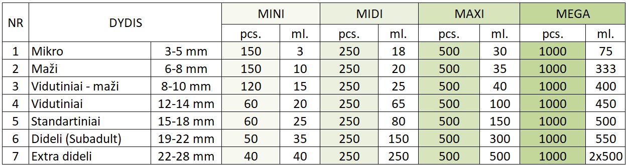 · Galimi pakuočių dydžiai: Mini (apie 40 - 150 svirplių), Midi (apie 250 svirplių), Maxi (apie 500 svirplių), Mega (apie 1000 svirplių)